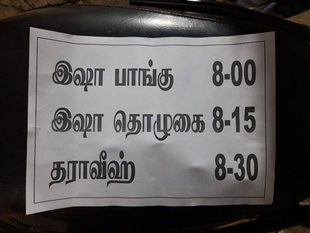 தராவீஹ் தொழுகை – 8:30 மணிக்கும் நடைபெறும் என அறிவிக்கப்பட்டுள்ளது.