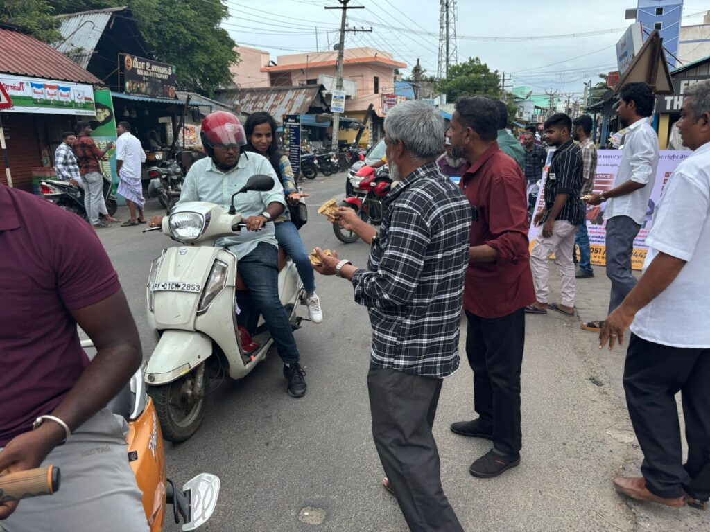 கோட்டக்குப்பம் மகாத்மா காந்தி சாலையில் உள்ள காயிதே மில்லத் நினைவு வளைவு அருகே, இன்று (ஜூலை 25, வெள்ளிக்கிழமை) மதியம் 1:30 மணியளவில் இந்த நிகழ்ச்சி சிறப்பாக நடைபெற்றது. இதில், மாட்டுச் சாணம், செம்மண், களிமண் உள்ளிட்ட இயற்கை உரங்களைக் கொண்டு தயாரிக்கப்பட்ட விதைப்பந்துகள் வழங்கப்பட்டன. இந்த பந்துகளில் அரசன், புளி, வேம்பு, வாகை, சுபாபுல் போன்ற மரங்களின் விதைகள் வைக்கப்பட்டிருந்தன.
