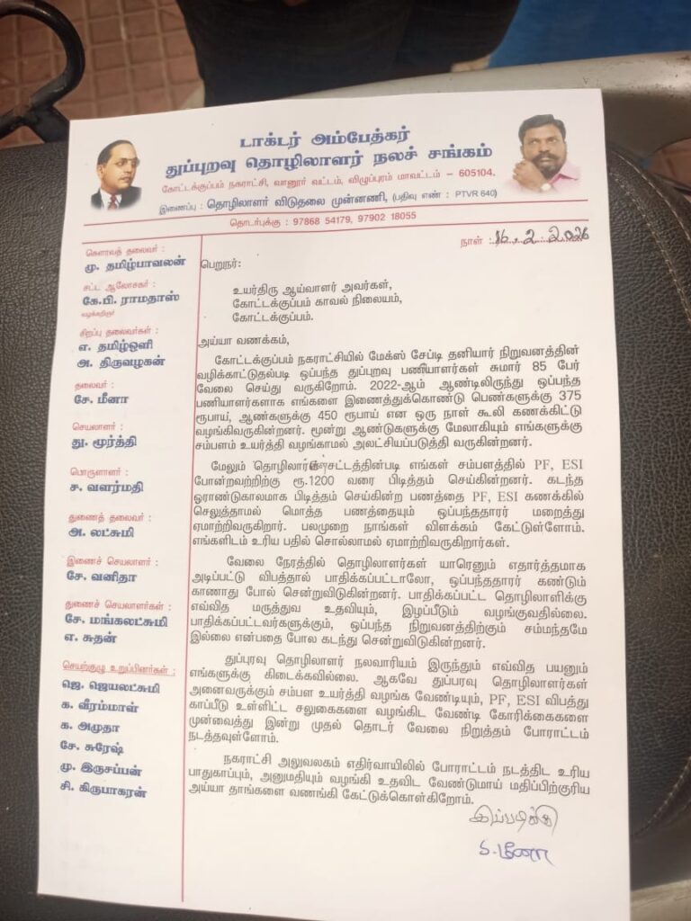 பி.எஃப், இ.எஸ்.ஐ முறைகேடு புகார்: கோட்டக்குப்பத்தில் தூய்மைப் பணியாளர்கள் தொடர் வேலைநிறுத்தம் – சுகாதார சீர்கேடு அபாயம்!