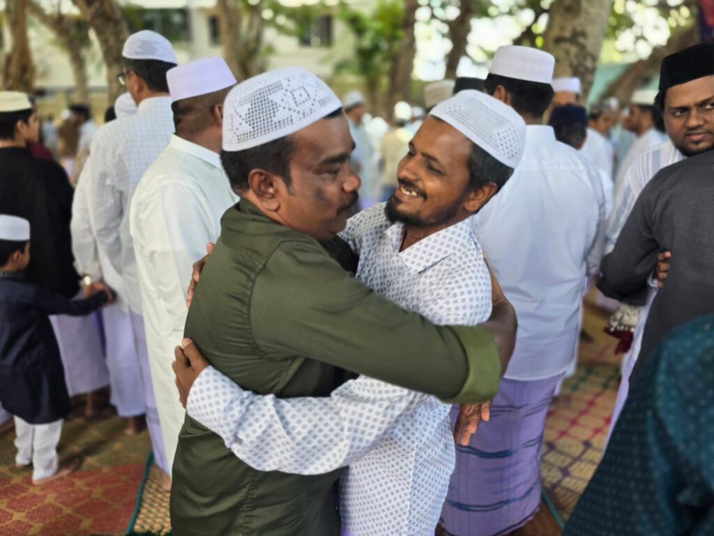 தொழுகை நிறைவடைந்ததும், சிறுவர்கள் முதல் பெரியவர்கள் வரை அனைவரும் ஒருவருக்கொருவர் ஆரத்தழுவி, தங்களின் ஈகைத் திருநாள் வாழ்த்துகளை மிகுந்த மகிழ்ச்சியுடன் பரிமாறிக் கொண்டனர்.